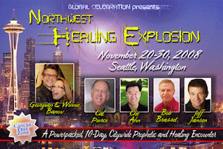 | Author Cal Pierce at the NAR's "Northwest Healing Explosion" advertised on TheElijahList, 11/07/08 where participants were "declaring the Northwest a 'cancer-free zone.'" |