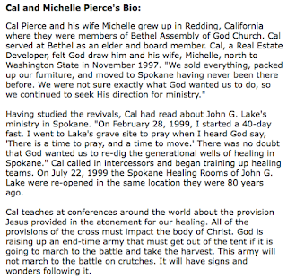 | Cal Pierce bio posted on TheElijahList, 11/07/06. See note at bottom of this post for more information. |