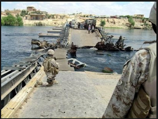 This particular type of bridge was designed to be assembled in pieces like a giant erector set, and it was designed to be assembled by manpower. Those pallets of bridge components also contained lifting bars. Two Marines or four Marines or how many as were needed would put on their gloves, pick up their lifting bars and literally lift each piece into position for assembly. It was backbreaking work... and did I mention it was raining?