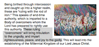 “Thus, they must be utterly slain in order for us to become the ‘habitation of God’ (priestly role), and begin to ‘rule all nations’ (kingly role)…. But we have been given dominion, and there should be a present expression of the higher realm of authority that we will be given in "that day" to rule on the earth in order to establish the Millennial Kingdom of God.”[14][emphasis added]