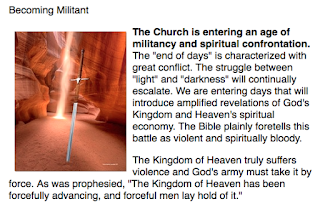 “These will be days of "blood and fire." Greater appreciation of the redemptive virtue of God's Blood and fiery conflicts between good and evil will prevail in coming days. Something truly noteworthy has been imparted into the spiritual DNA of this generation who qualify as overcomers – they are jealous for God in a militant way. The Lord is a Warrior and those joined to Him share in His warlike attributes.”[15] [emphasis added]