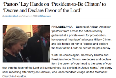 7. Heather Clark, “‘Pastors’ Lay Hands on ‘President-to-Be Clinton’ to ‘Decree and Declare Favor of the Lord,” 2/4/16, http://christiannews.net/2016/02/04/pastors-lay-hands-on-president-to-be-clinton-to-decree-and-declare-favor-of-the-lord/